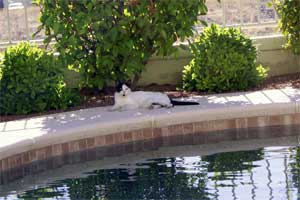 | This is a picture of MooCow. She's a neighborhood cat who visits our yard to drink from the bird's dish (which is on the ground) or from the pool. We don't know her real name or where she lives. Hailey calls her the MooCow Kitty because of her coloring. So I put this on the web just for Hailey |  | ||