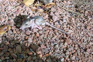 ground squirrels or lizards will fall in trying to get a drink.  I ran out to get the net, which is usually attached to a long pole. This time it wasn't, so I just grabbed the pole. It was difficult to help the animal as the pole was slippery, but I eventually got him over to the side. I didn't think it looked like a squirrel, but I couldn't see just what he was. As I lifted him over the side and onto the cool deck, I could see that he was a rat! On quick second look, though, I noticed his long tail and back legs, and realized that he was a kangaroo rat. He was totally exhausted. I'm sure I scared him to death and he tried to get moving a couple times but he'd just keel over on his side. As I put the pole back, I heard a plop, and, sure enough, he'd fallen back in the pool. This time since he was close to the edge, I grabbed the net and scooped him out. I carried him away from the pool and put him under a bush. He didn't even try to move, which gave me a great opportunity to get a picture of him. I checked on him about an hour later. He had his eyes closed and was very still. I had to lean down close to him to see a slight movement of his ribs to know that he was still alive. He was sleeping and not even the noise of my stepping close to him on the rocks woke him up. A couple hours later I checked and he was gone. I quickly scanned the pool to be sure he hadn't gone back in, but all was clear. | |||